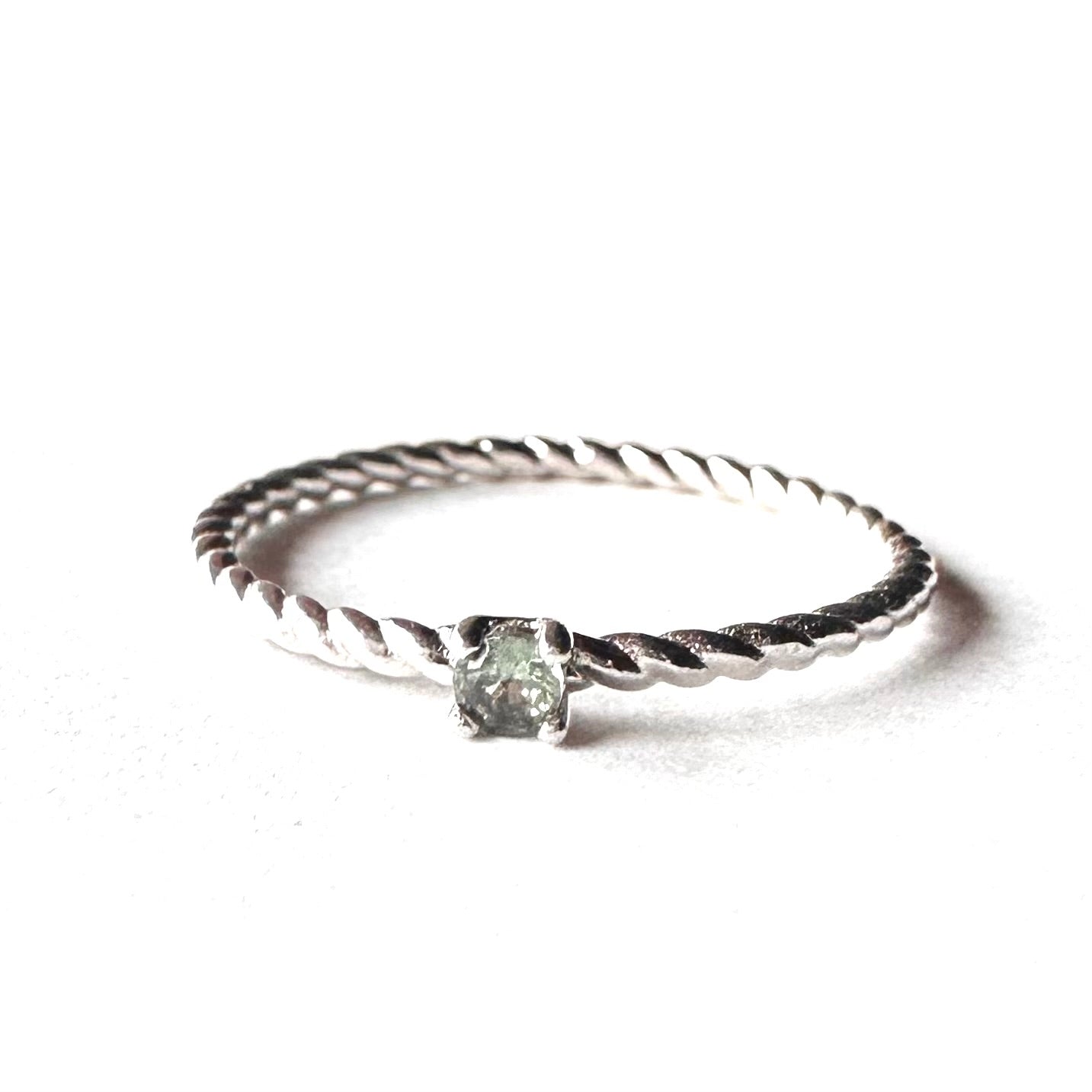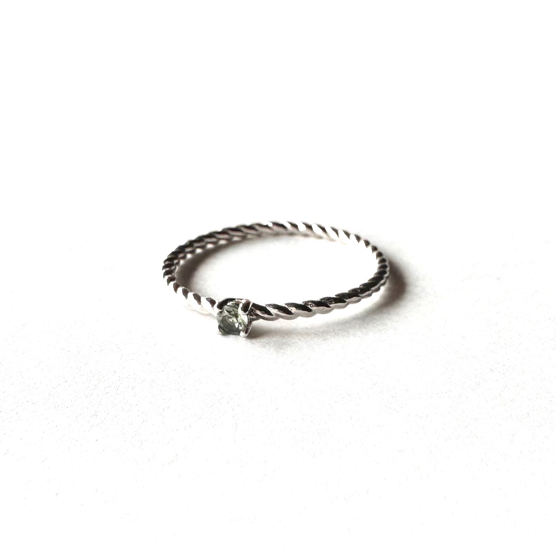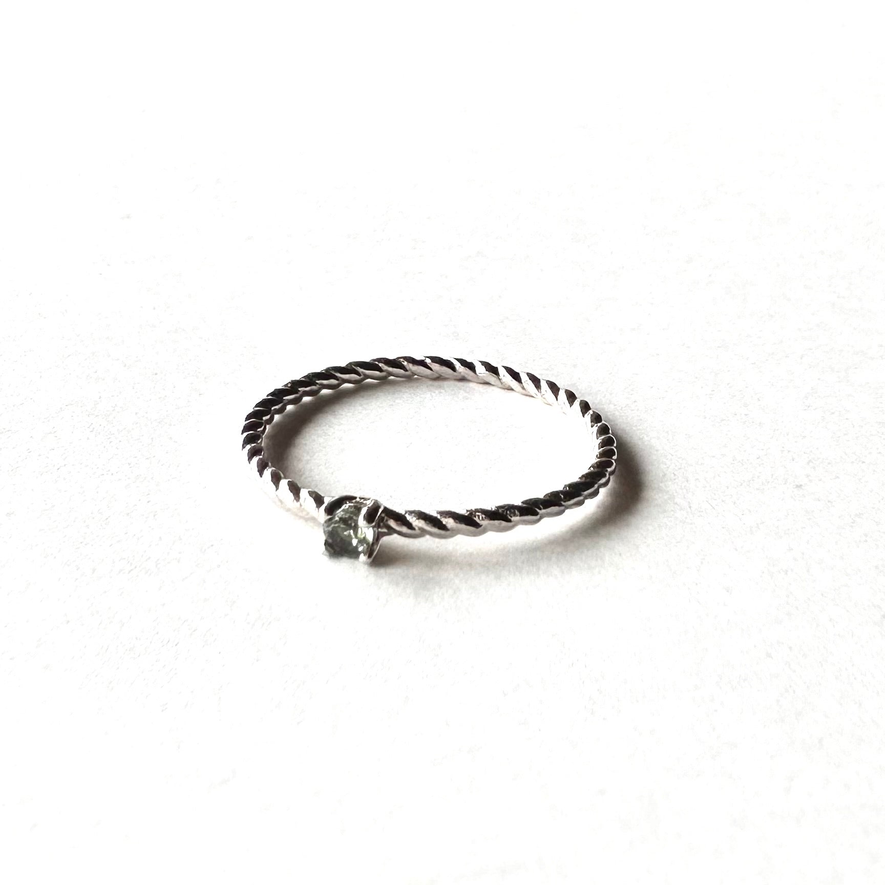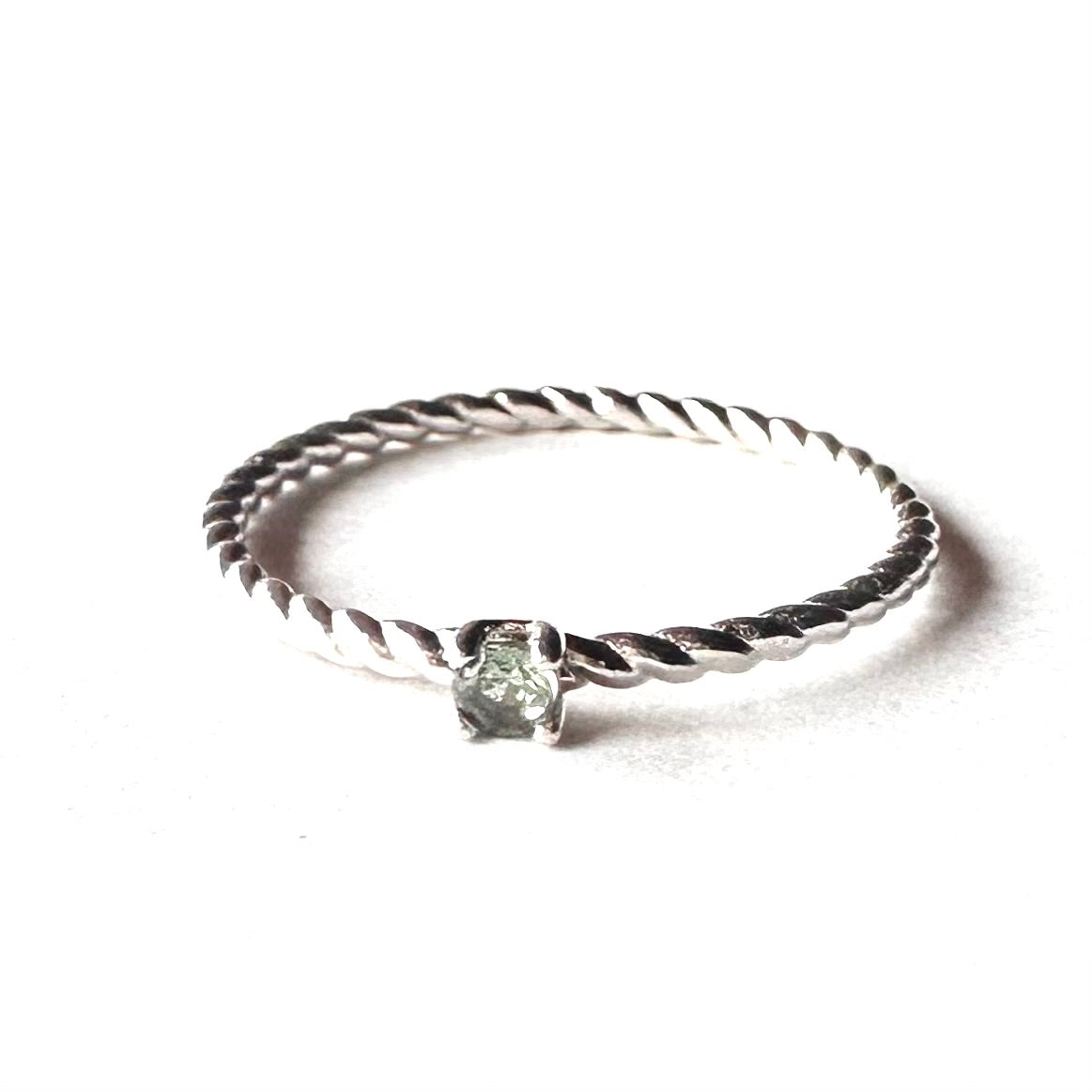 淡いグリーンのペリドットカラーグラスが光るシルバーリング。