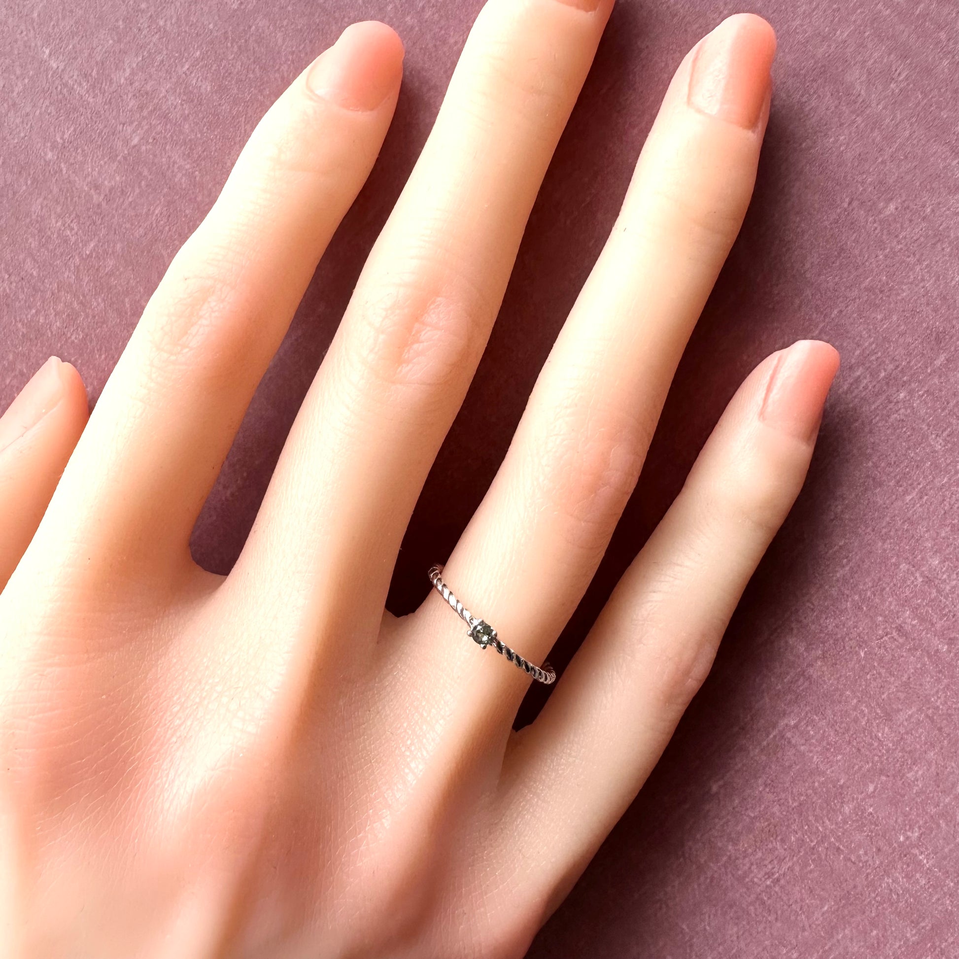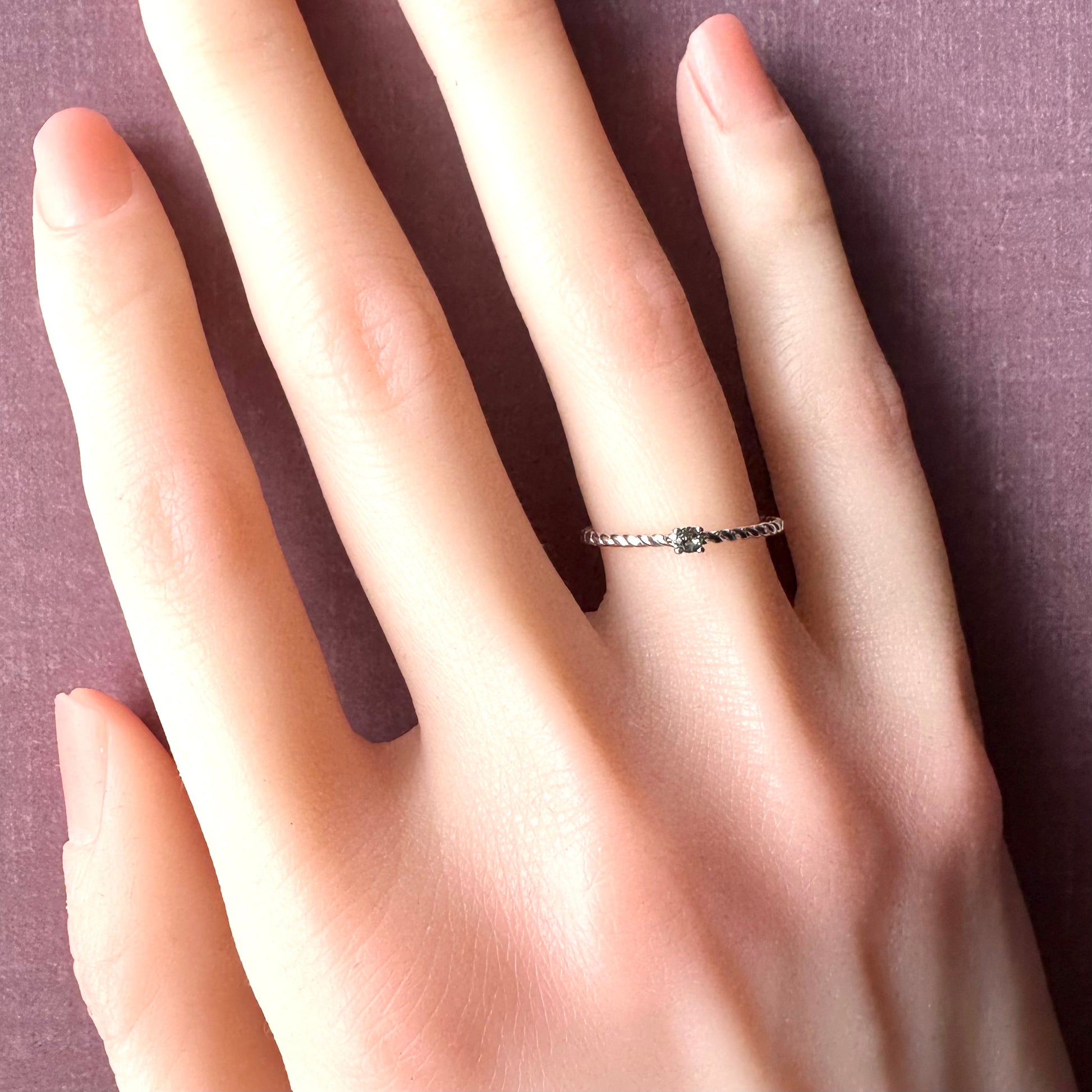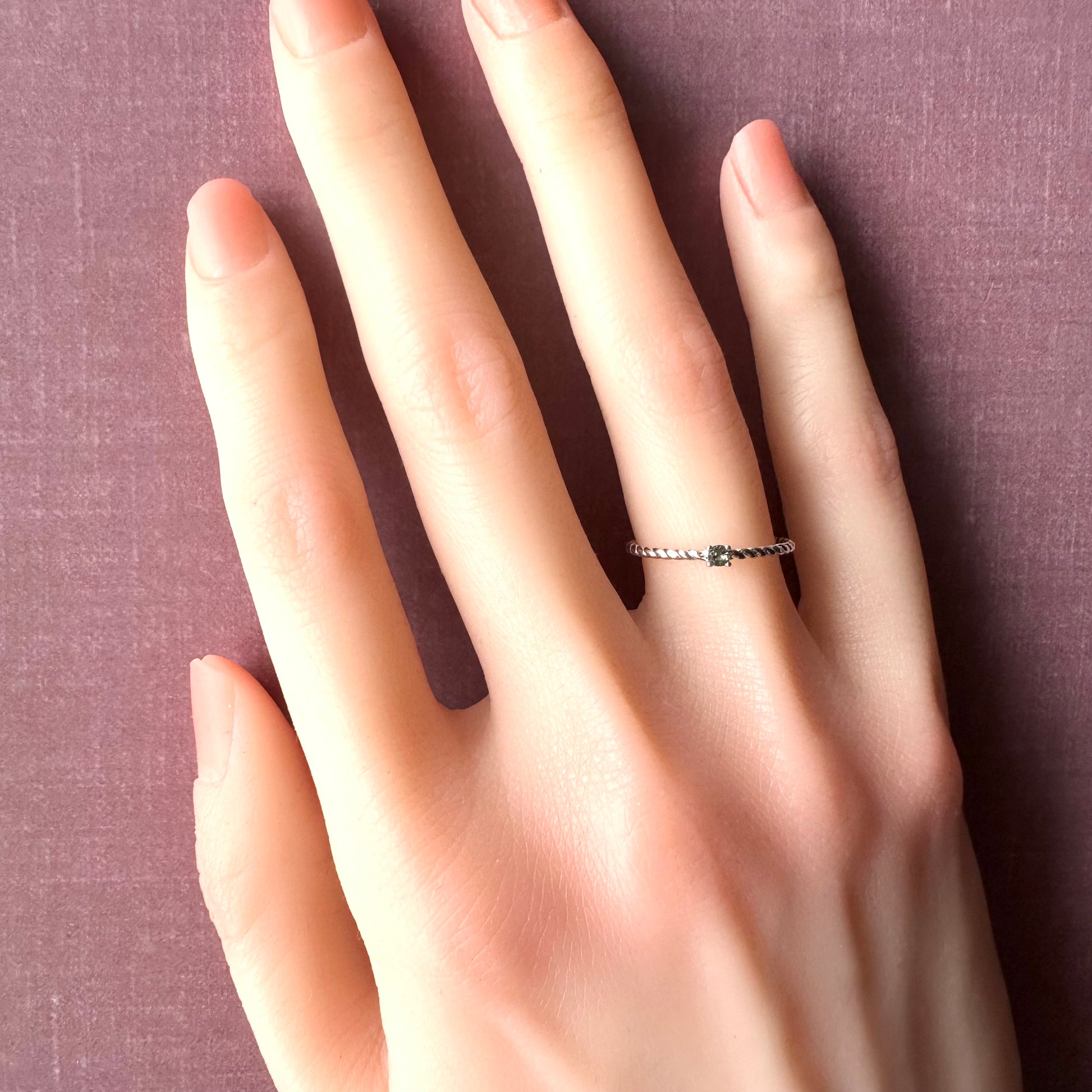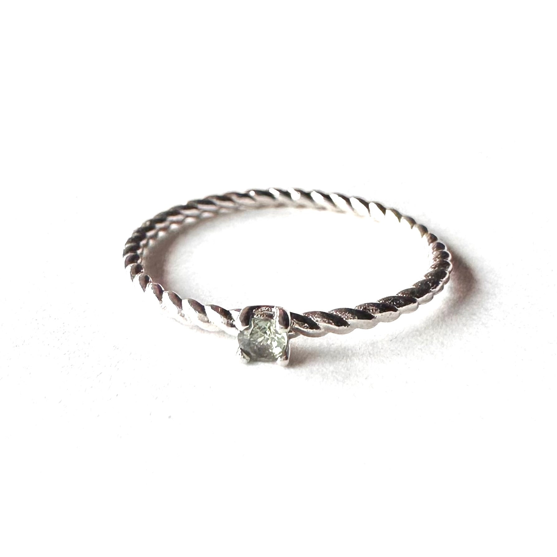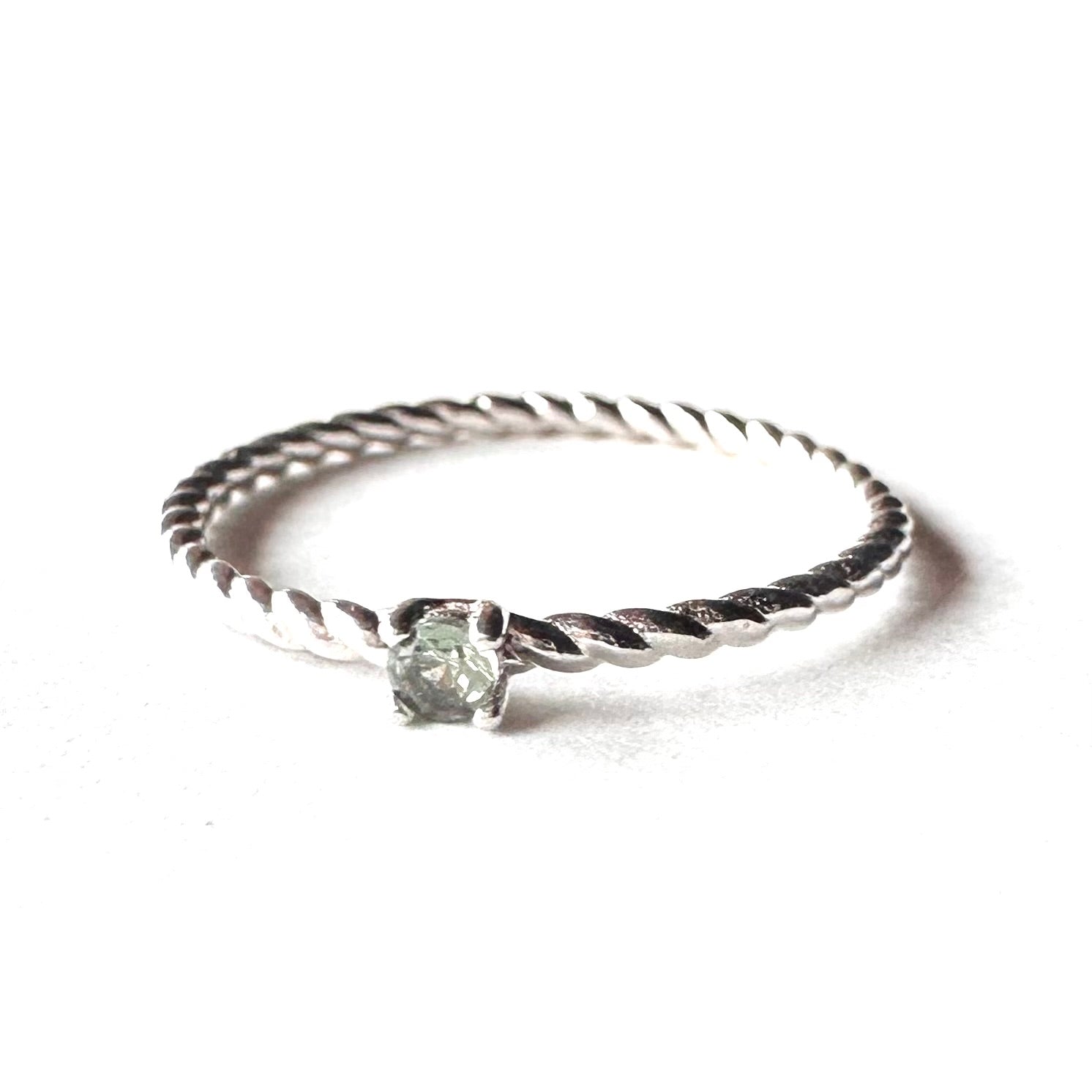 淡いグリーンのペリドットカラーグラスが光るシルバーリング。