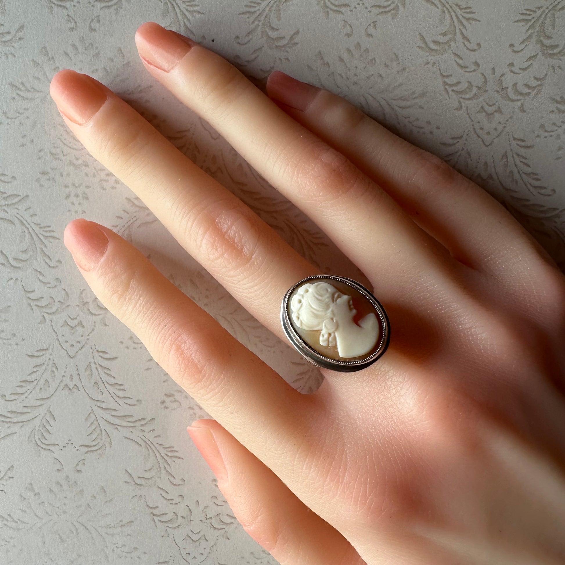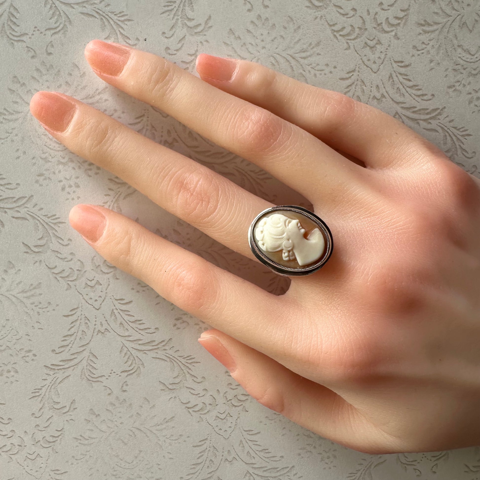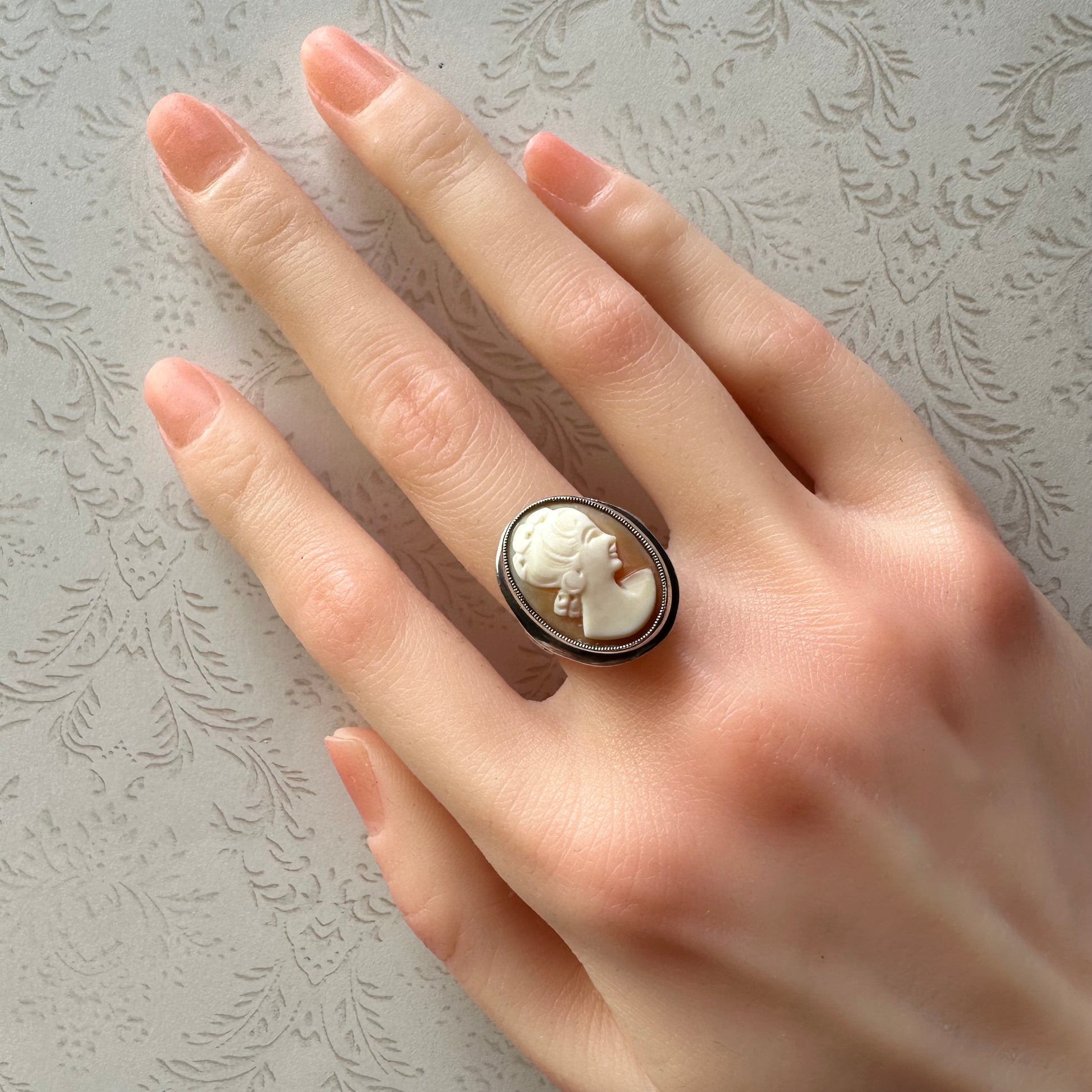 柔らかなピンクオレンジの天然シェルに彫られた女性の横顔は、