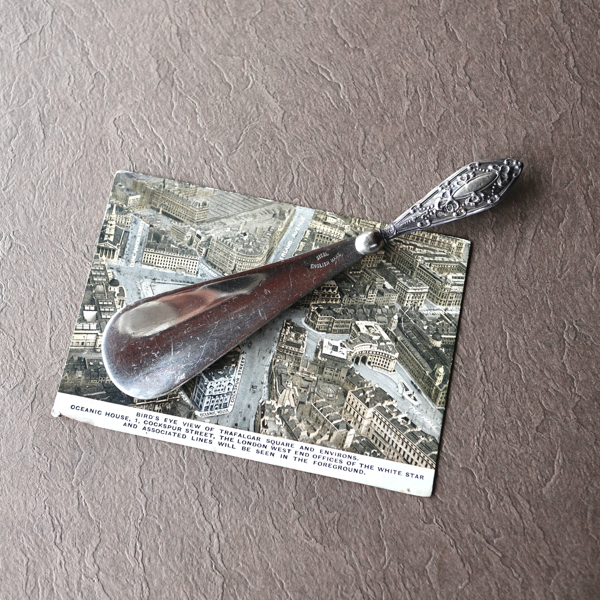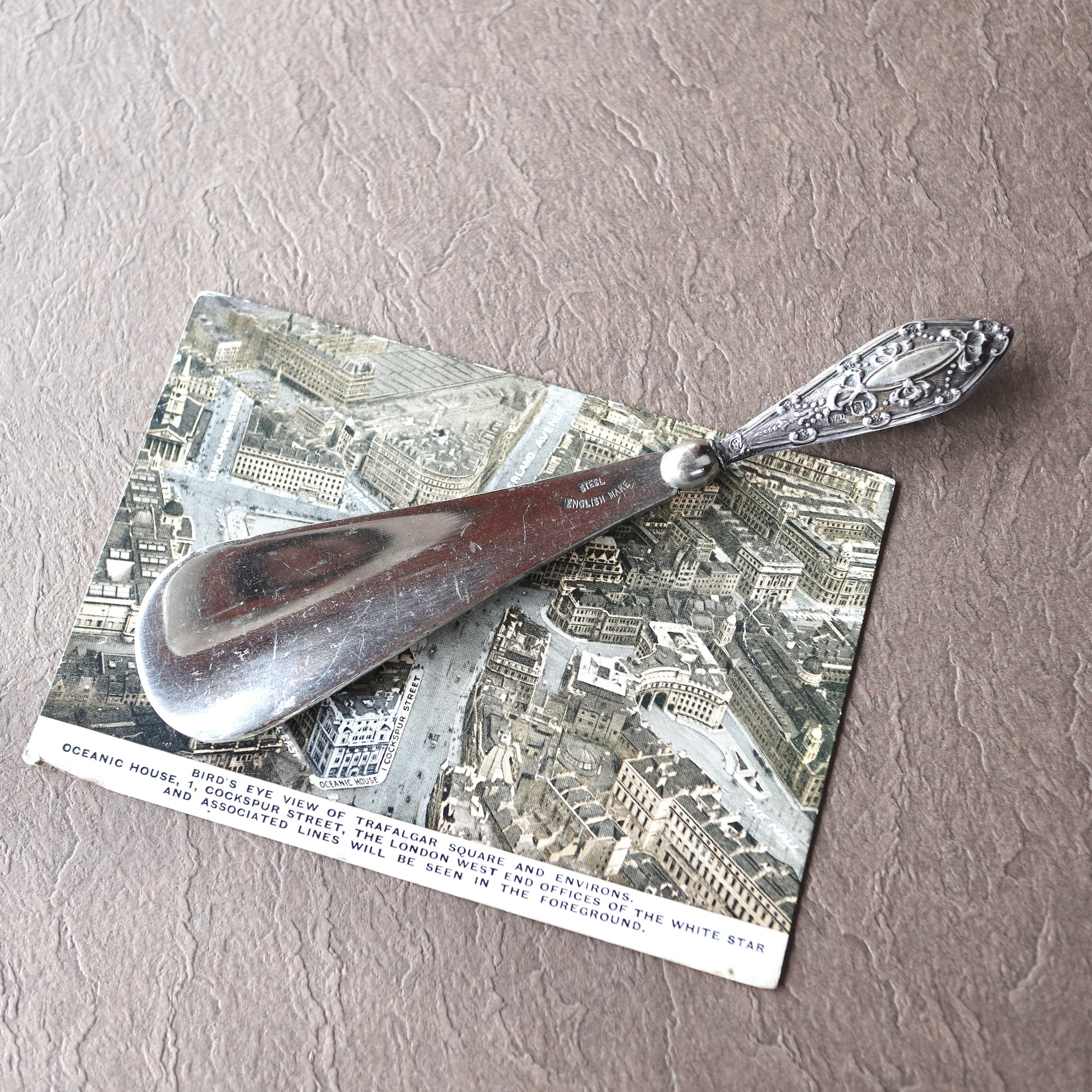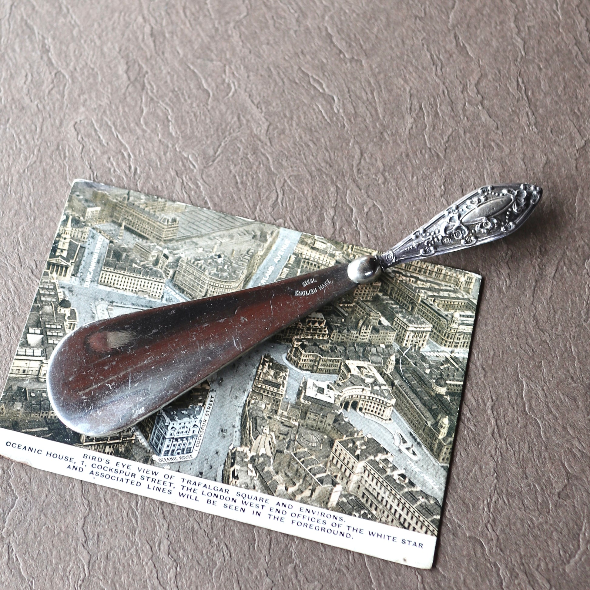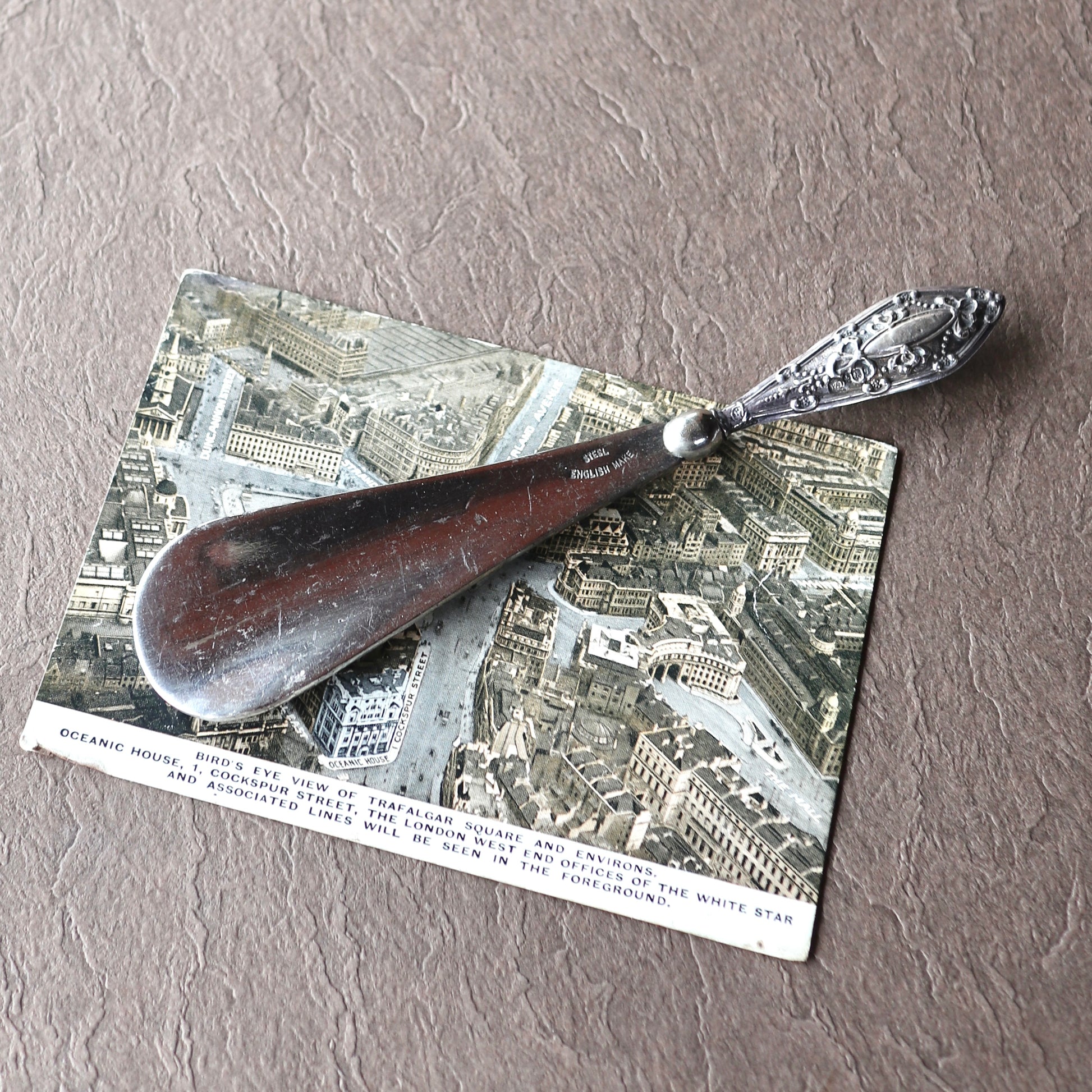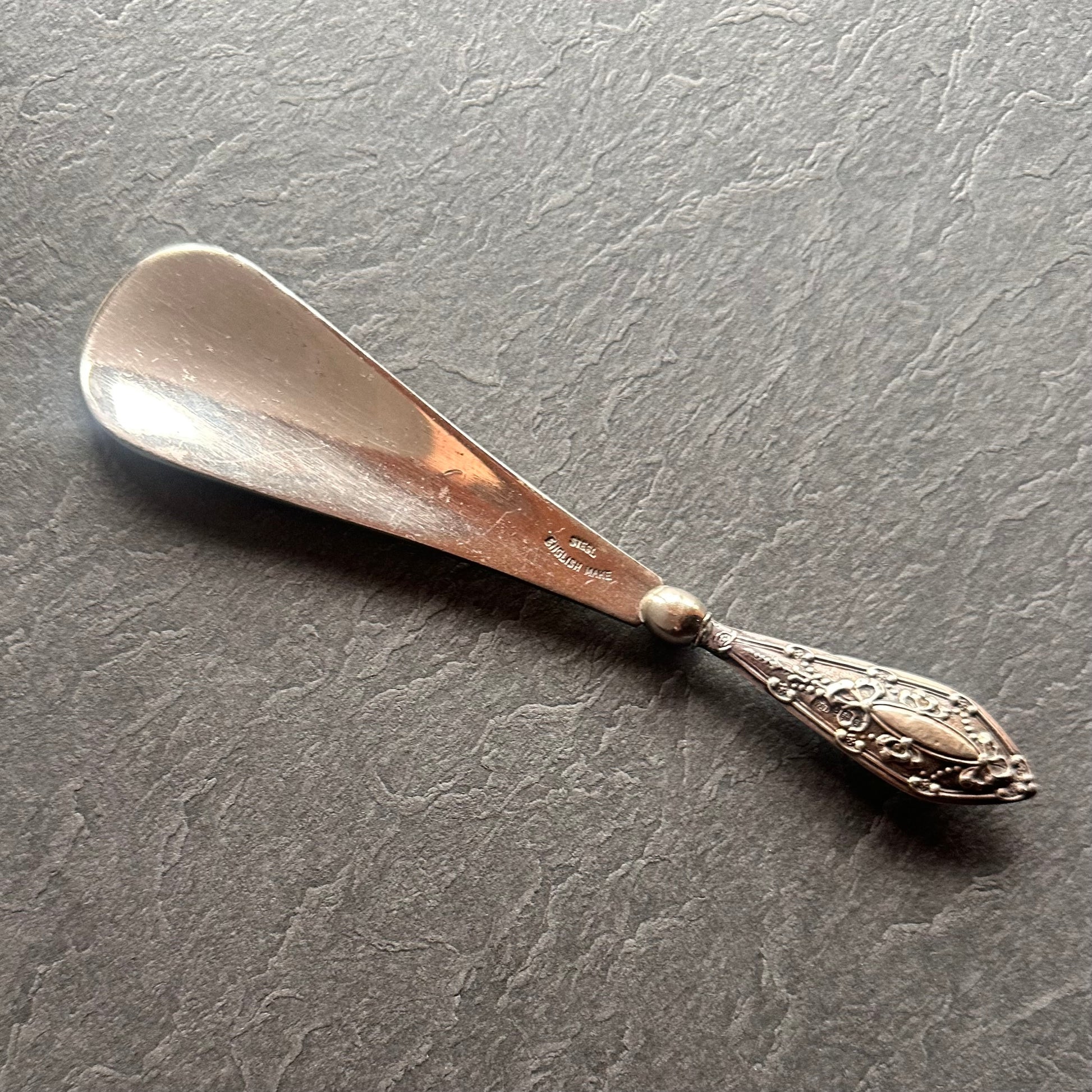 ボディの部分はスチール製のアンティークの靴べら。