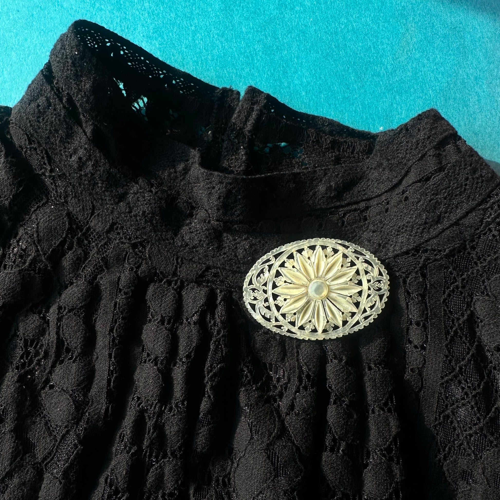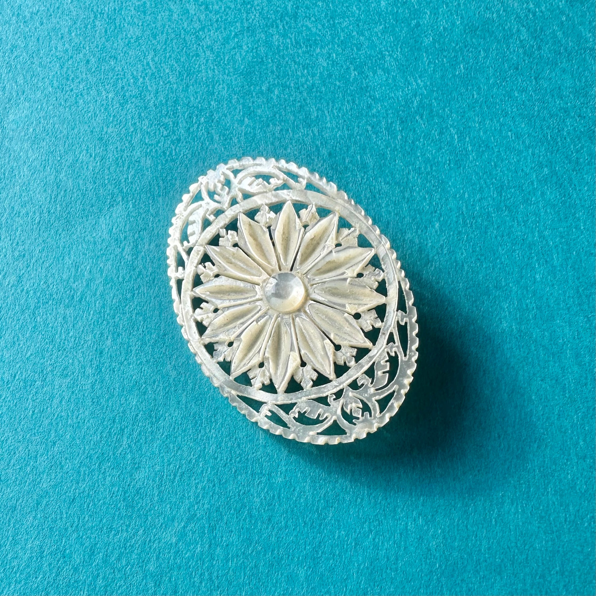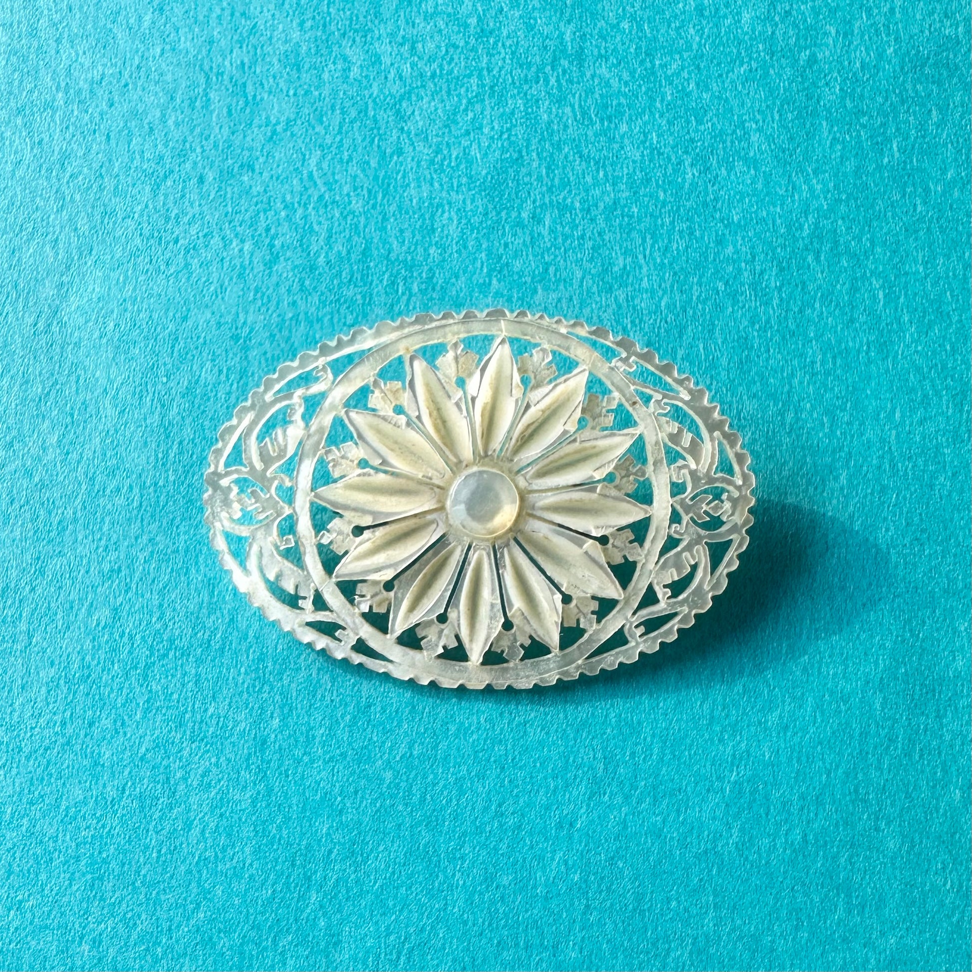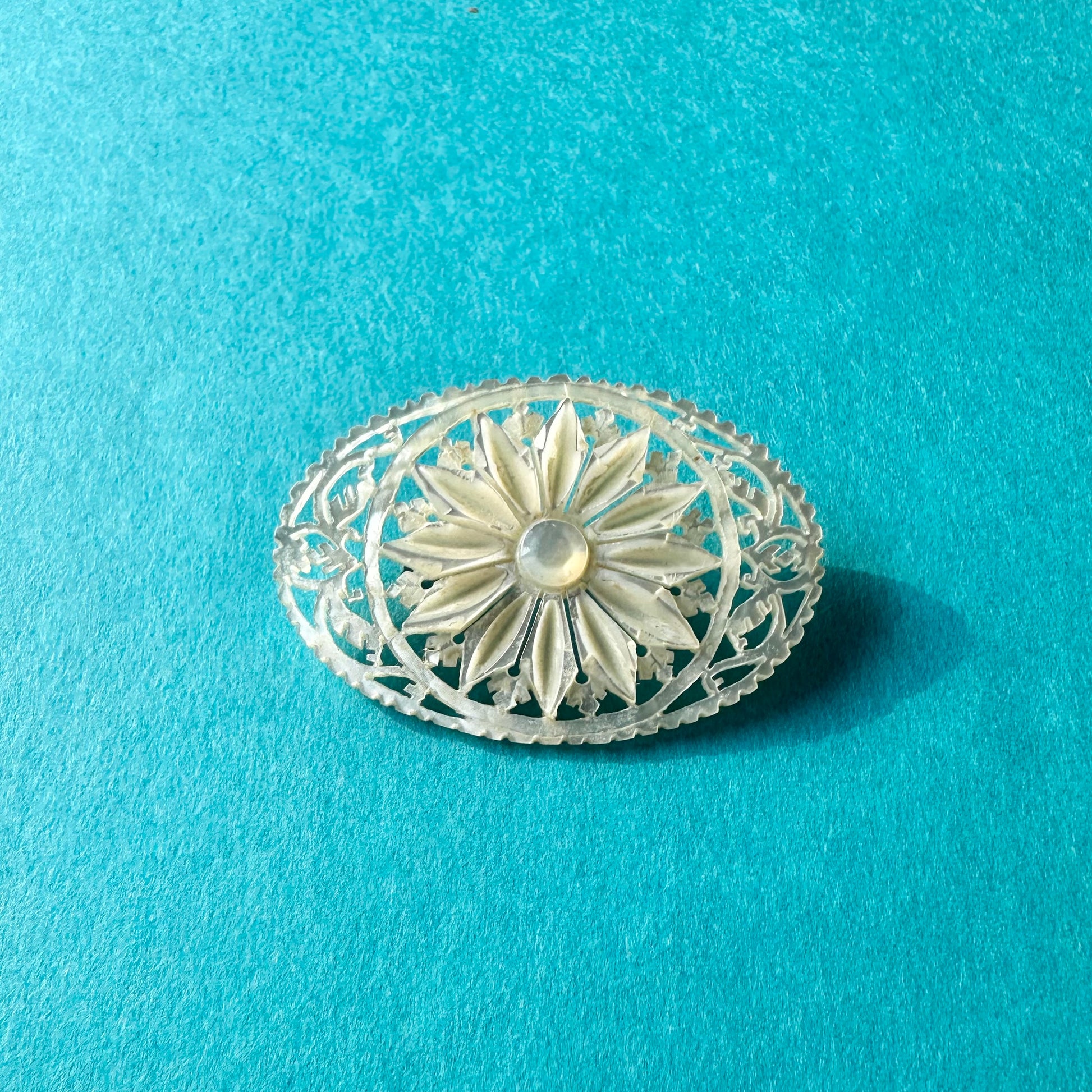 こちらはベツレヘムパールのフラワーモチーフブローチ。
