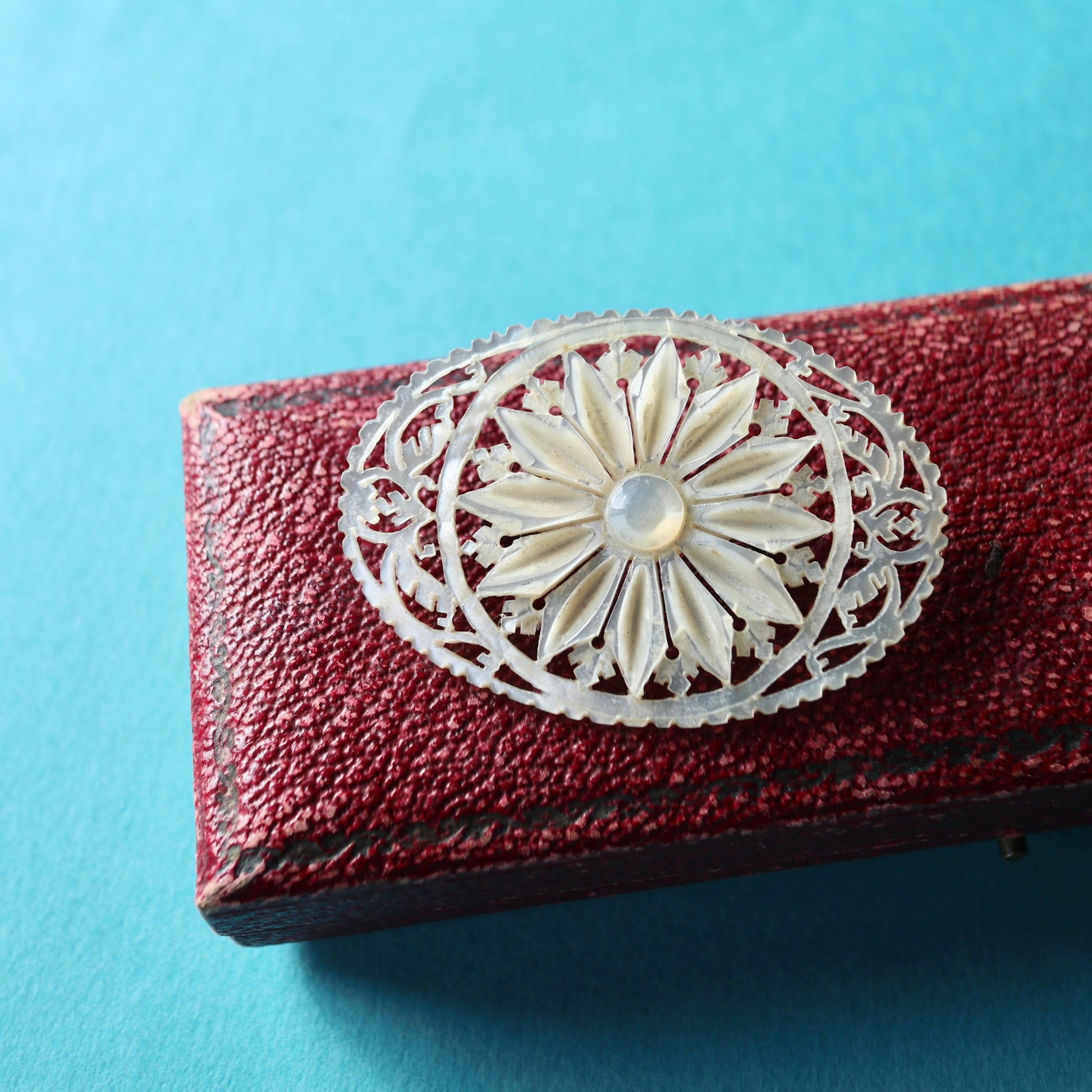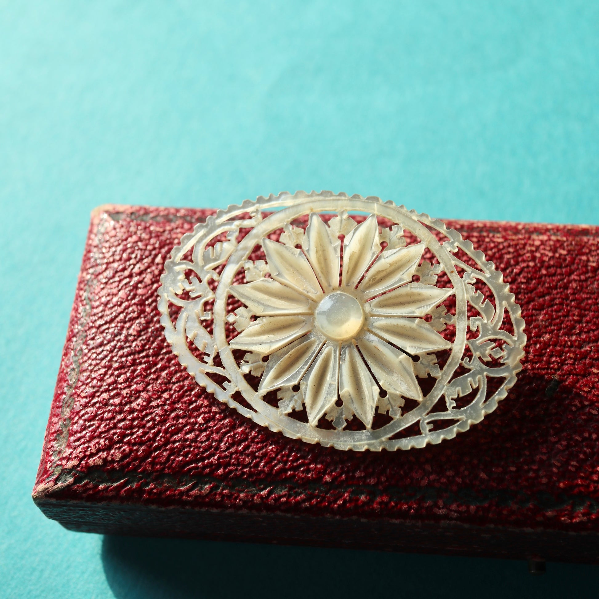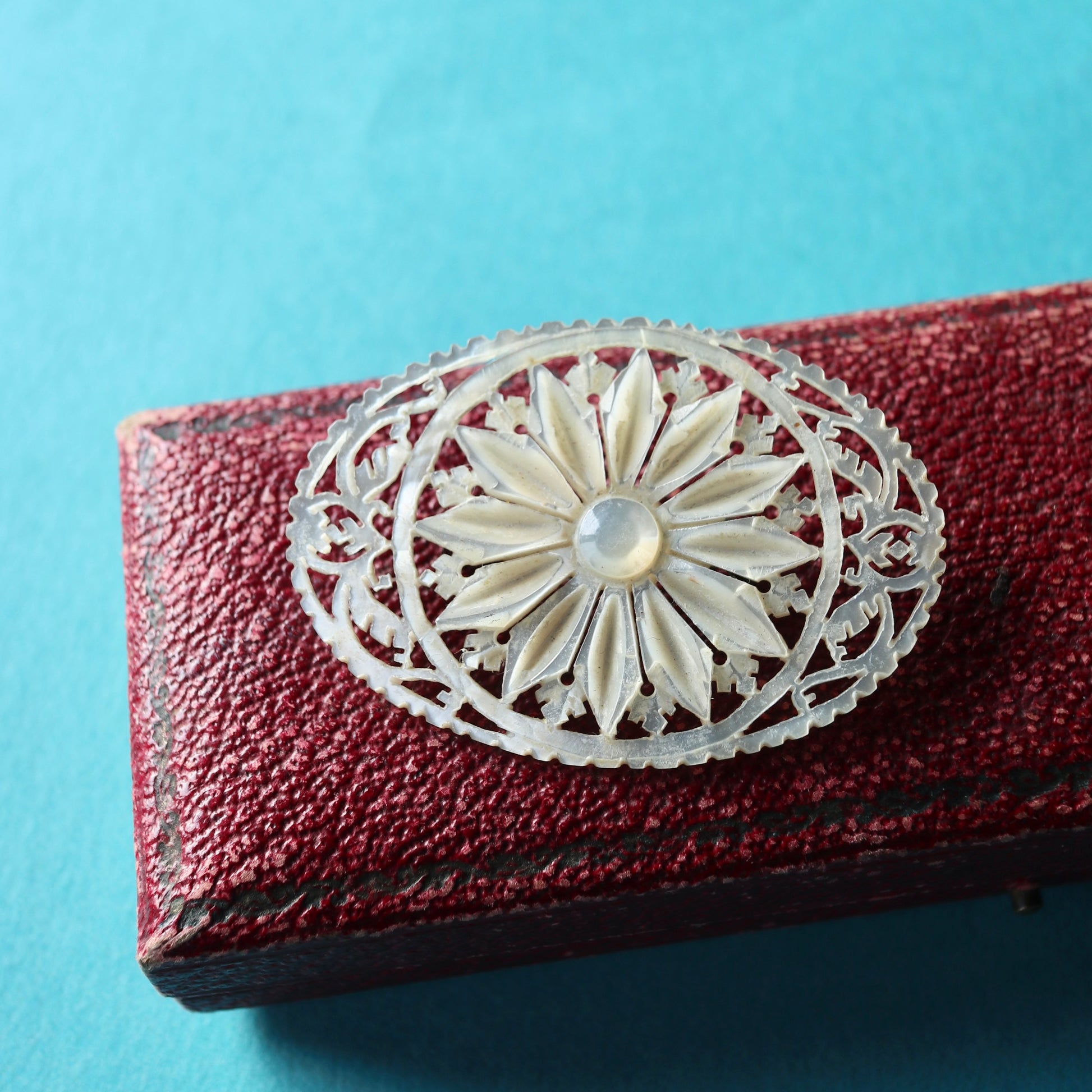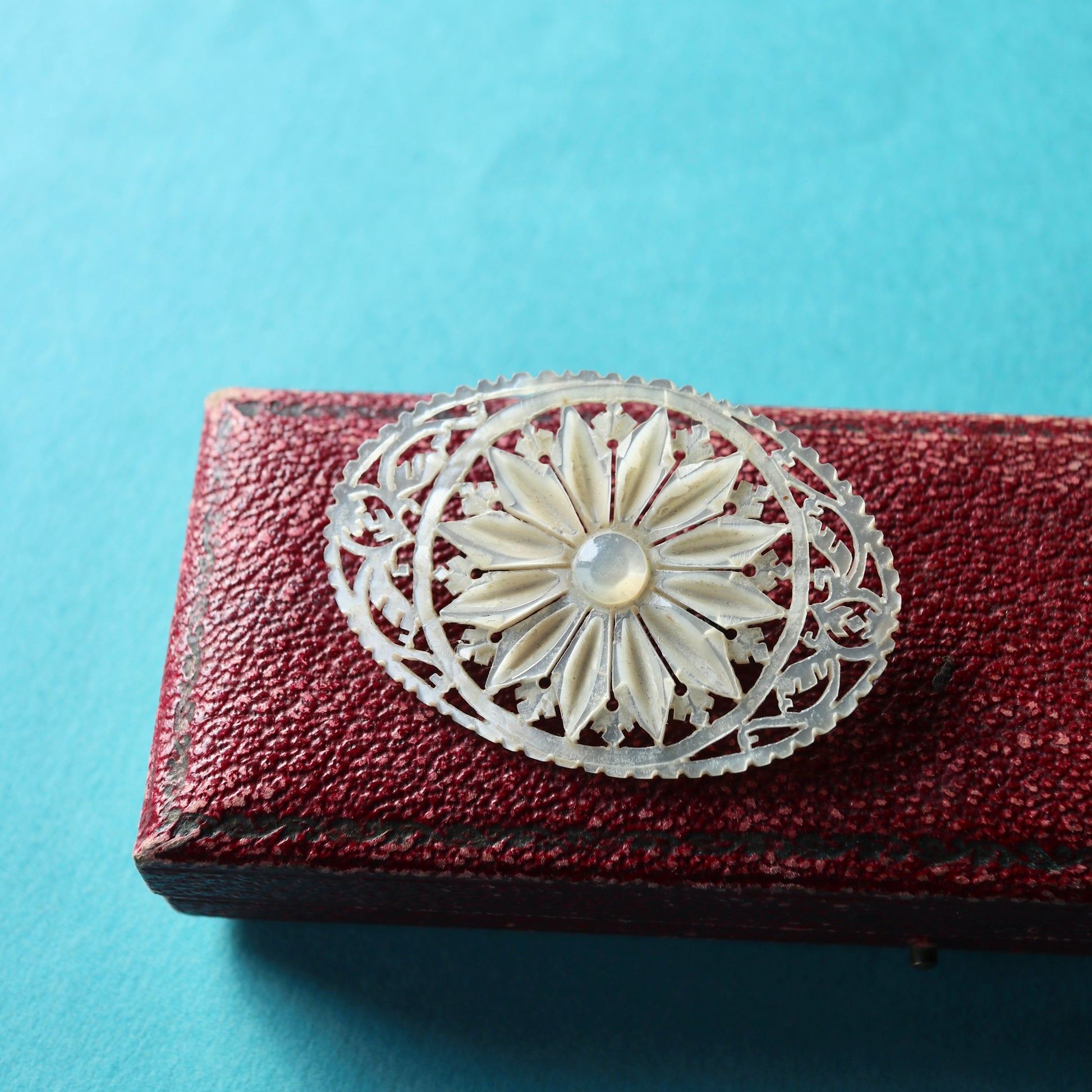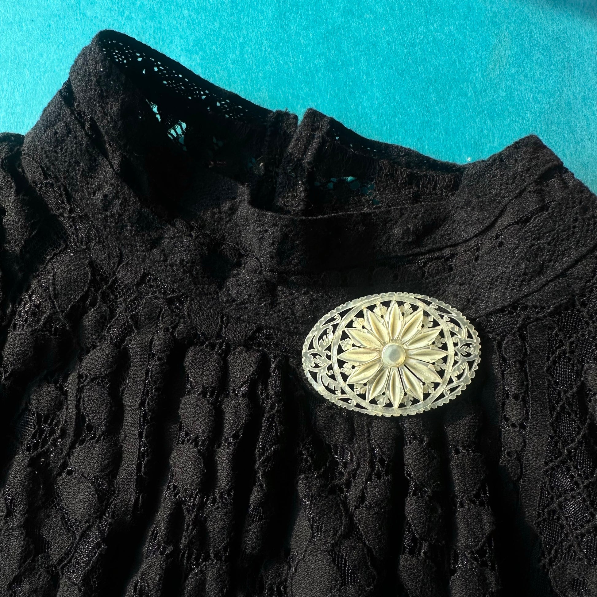 こちらはベツレヘムパールのフラワーモチーフブローチ。