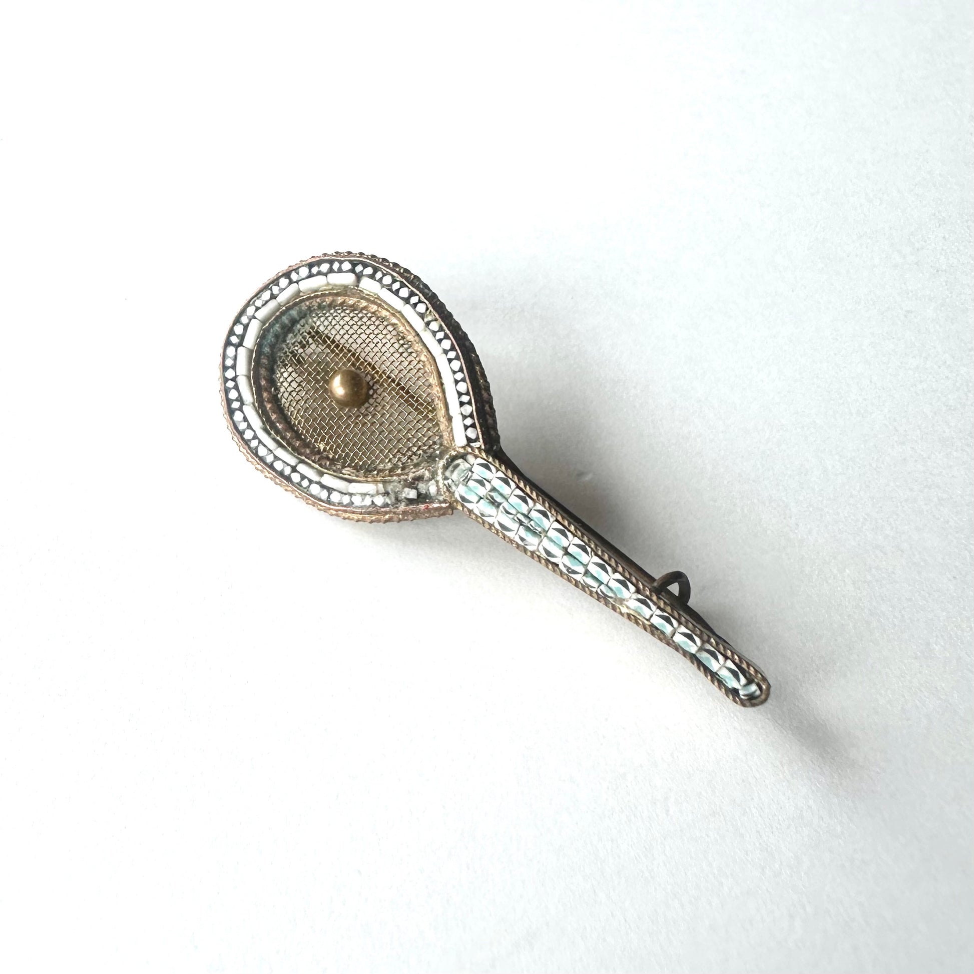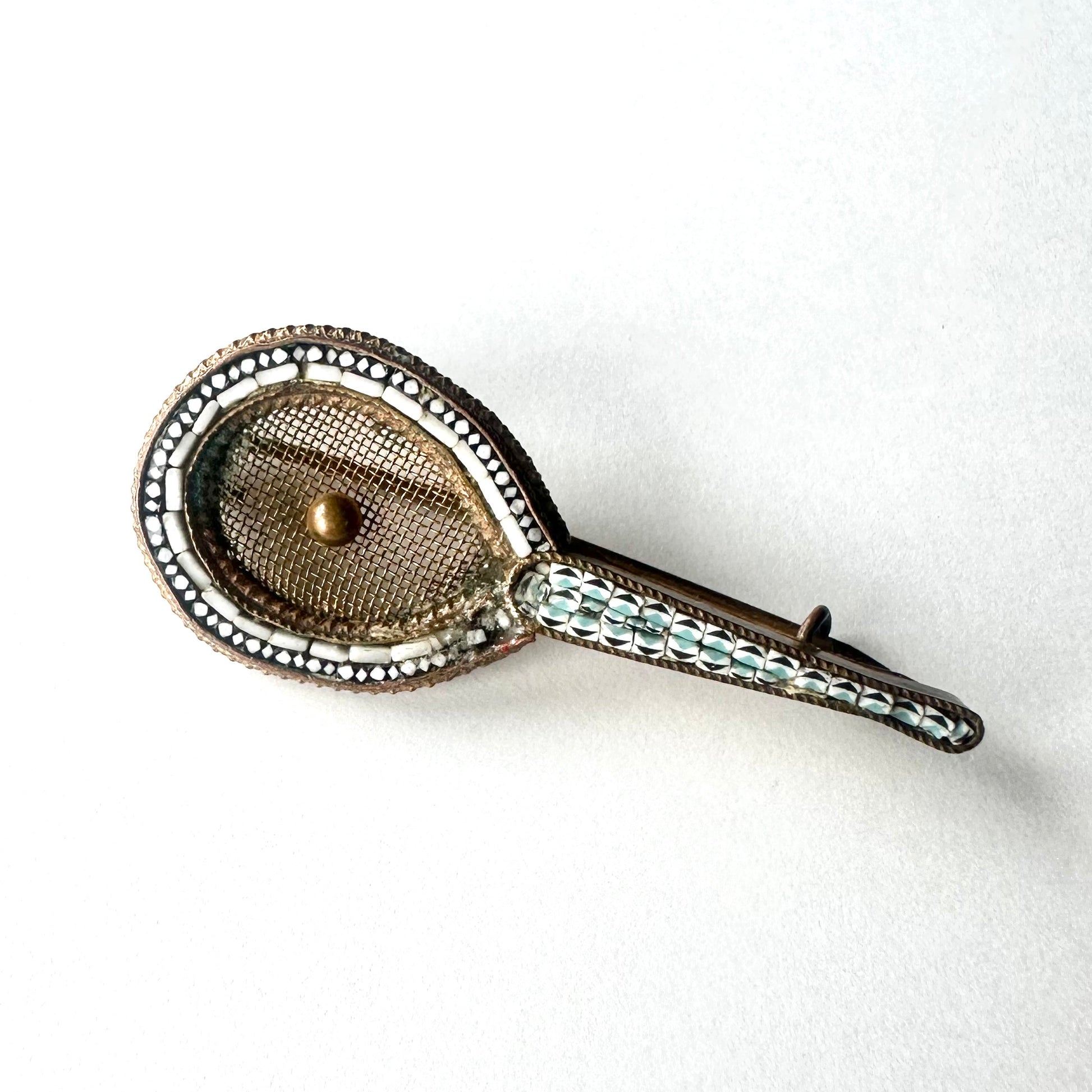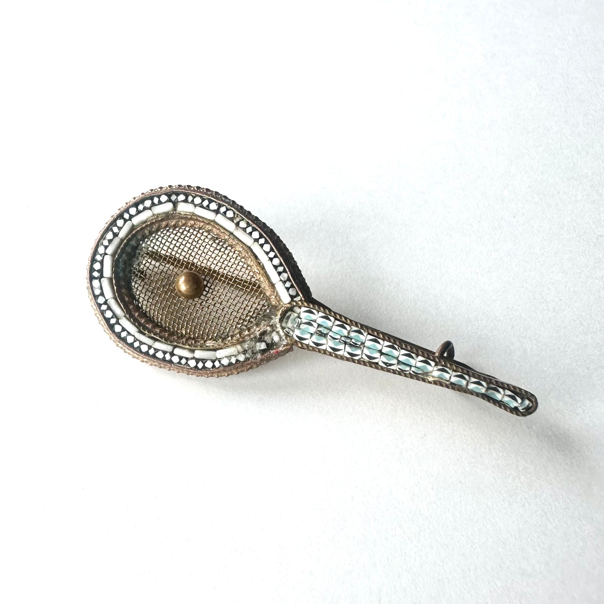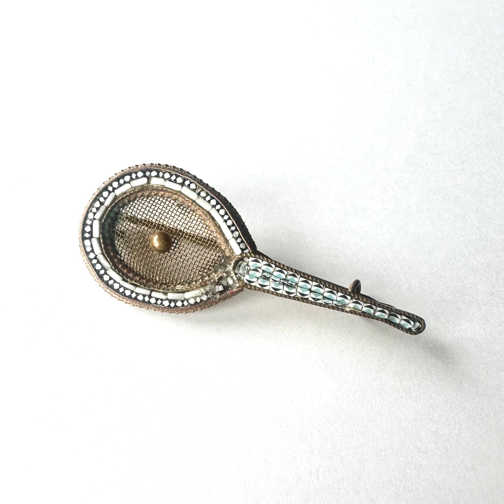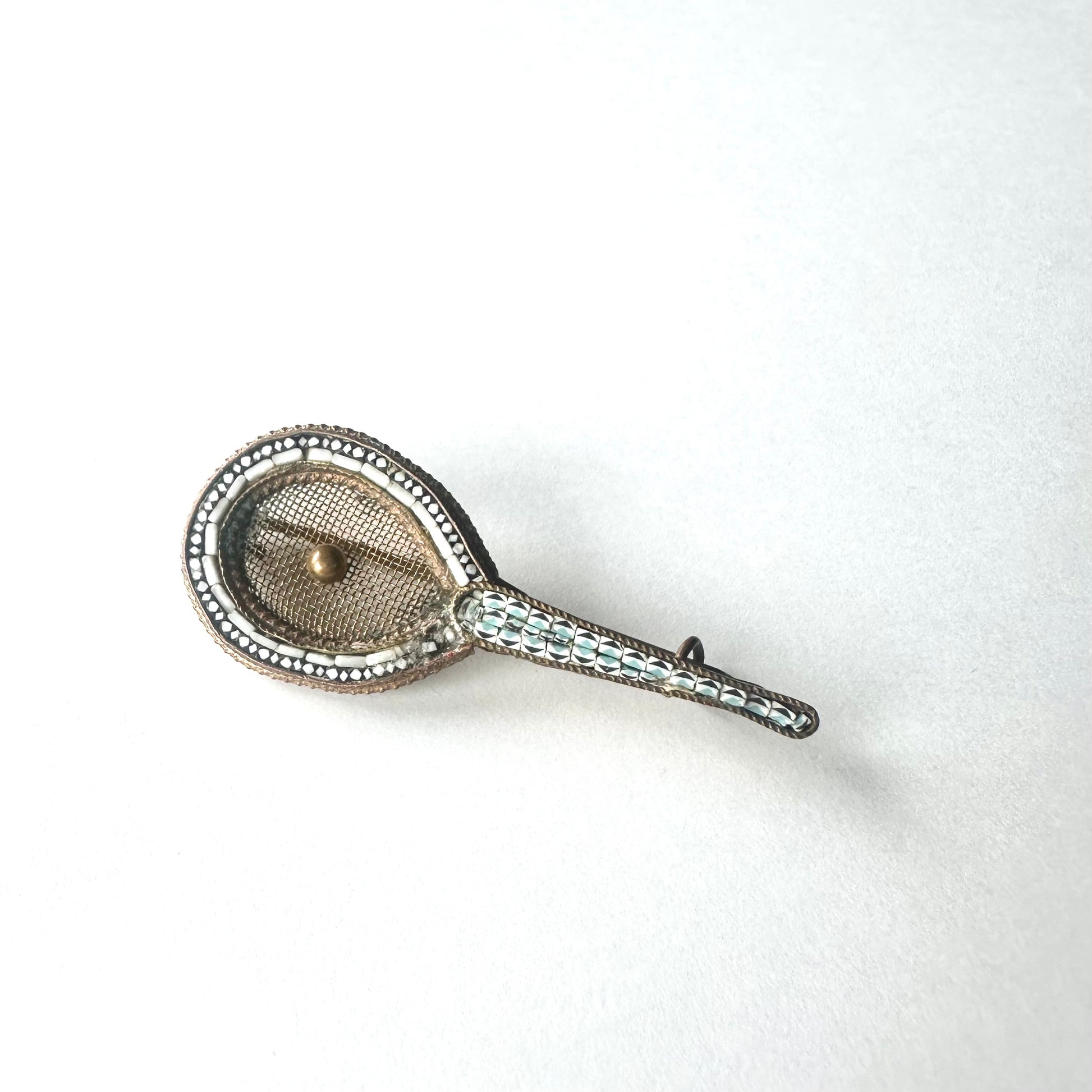 テニスラケットのモチーフのマイクロモザイクブローチ。
