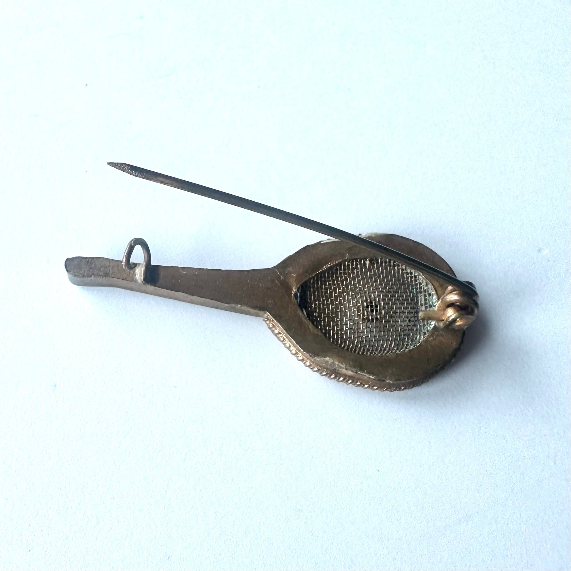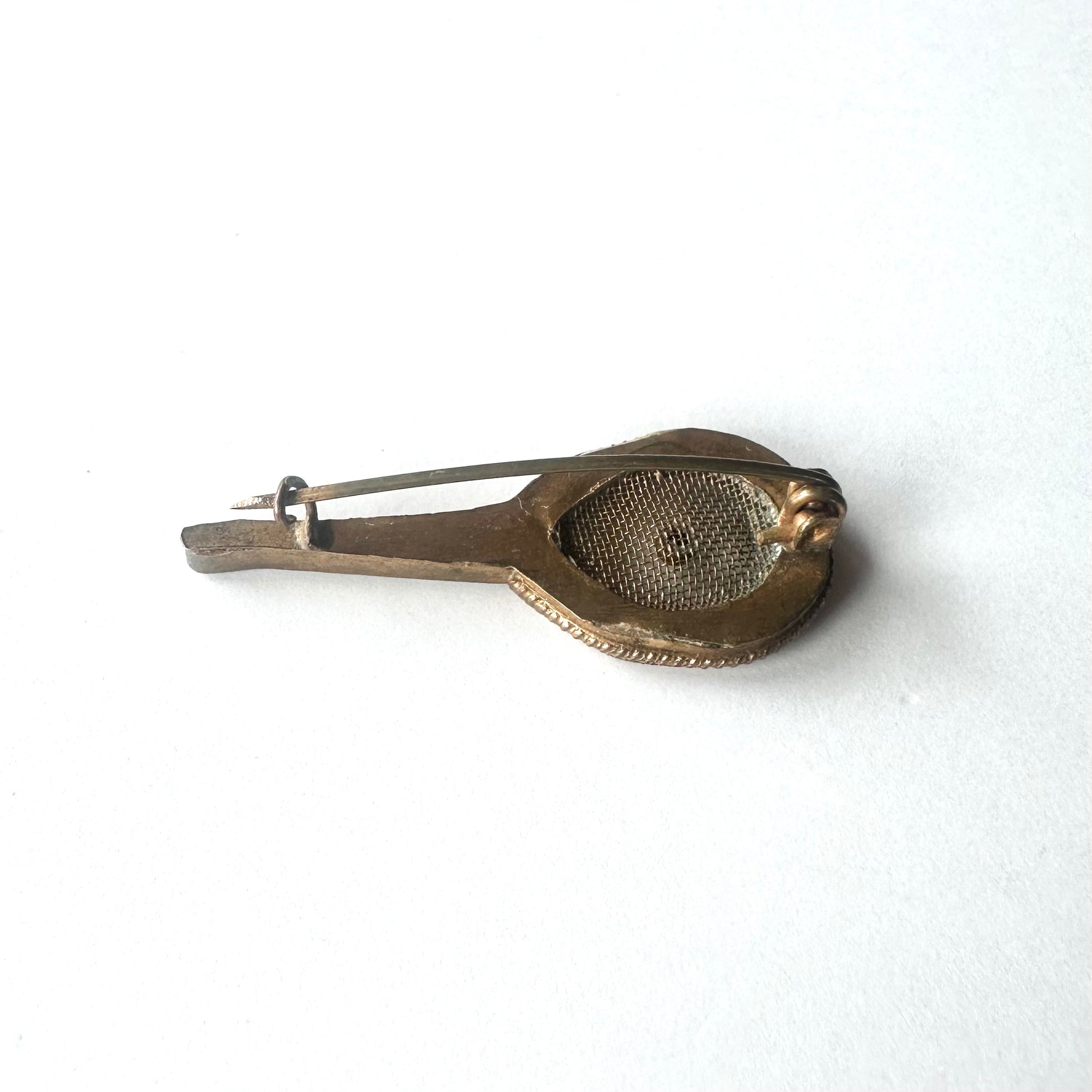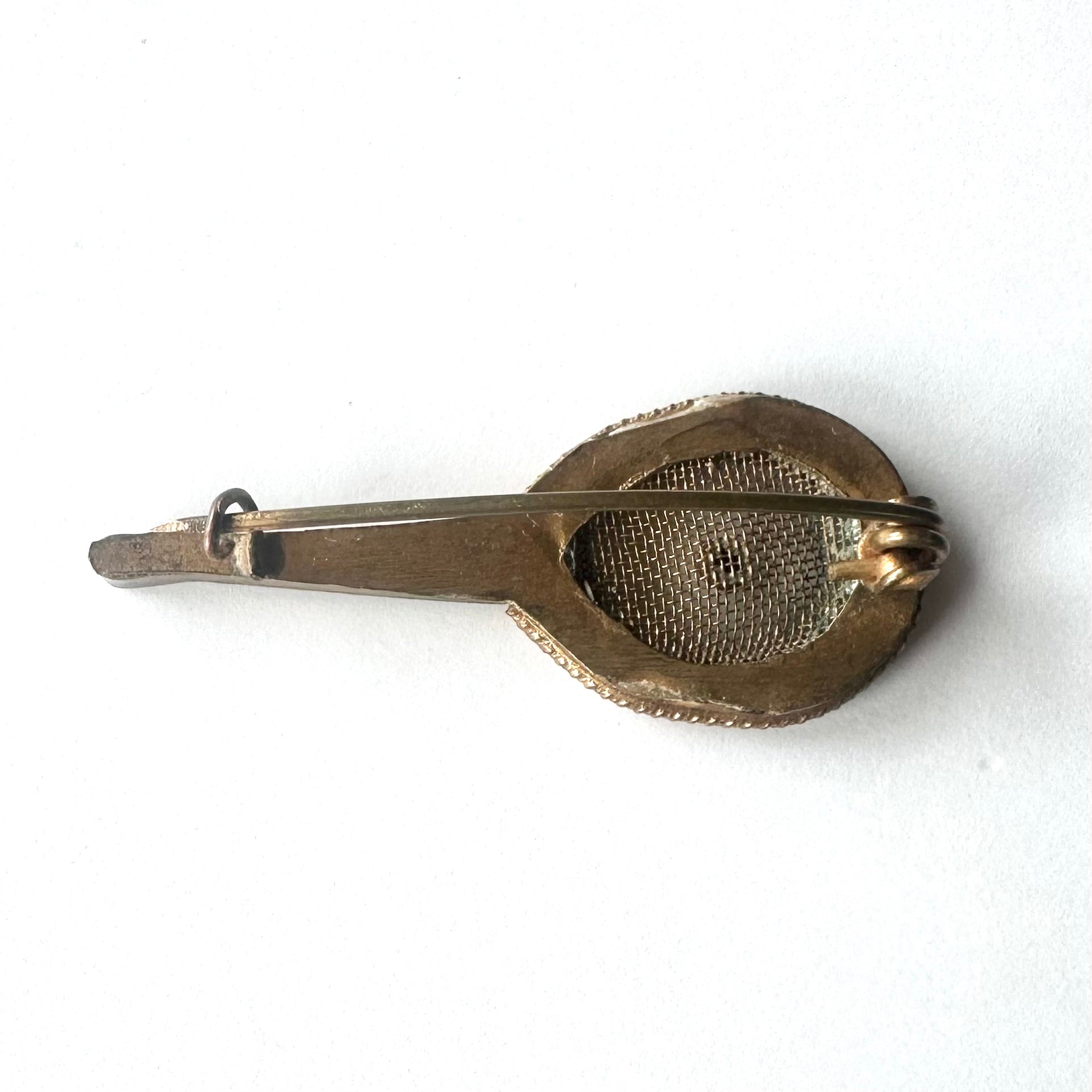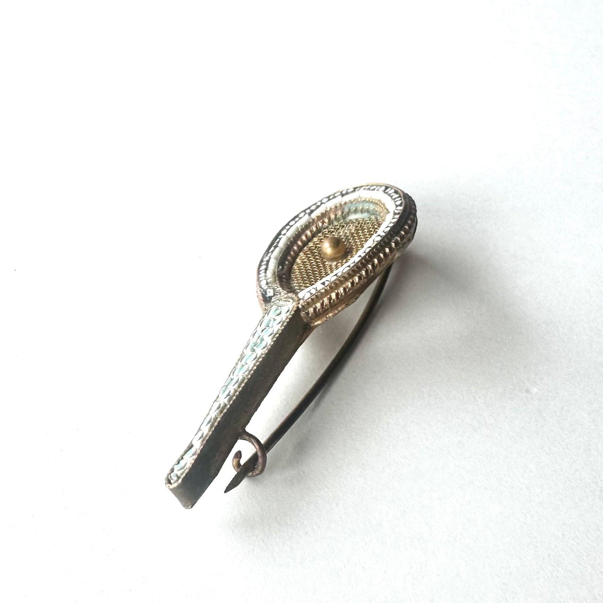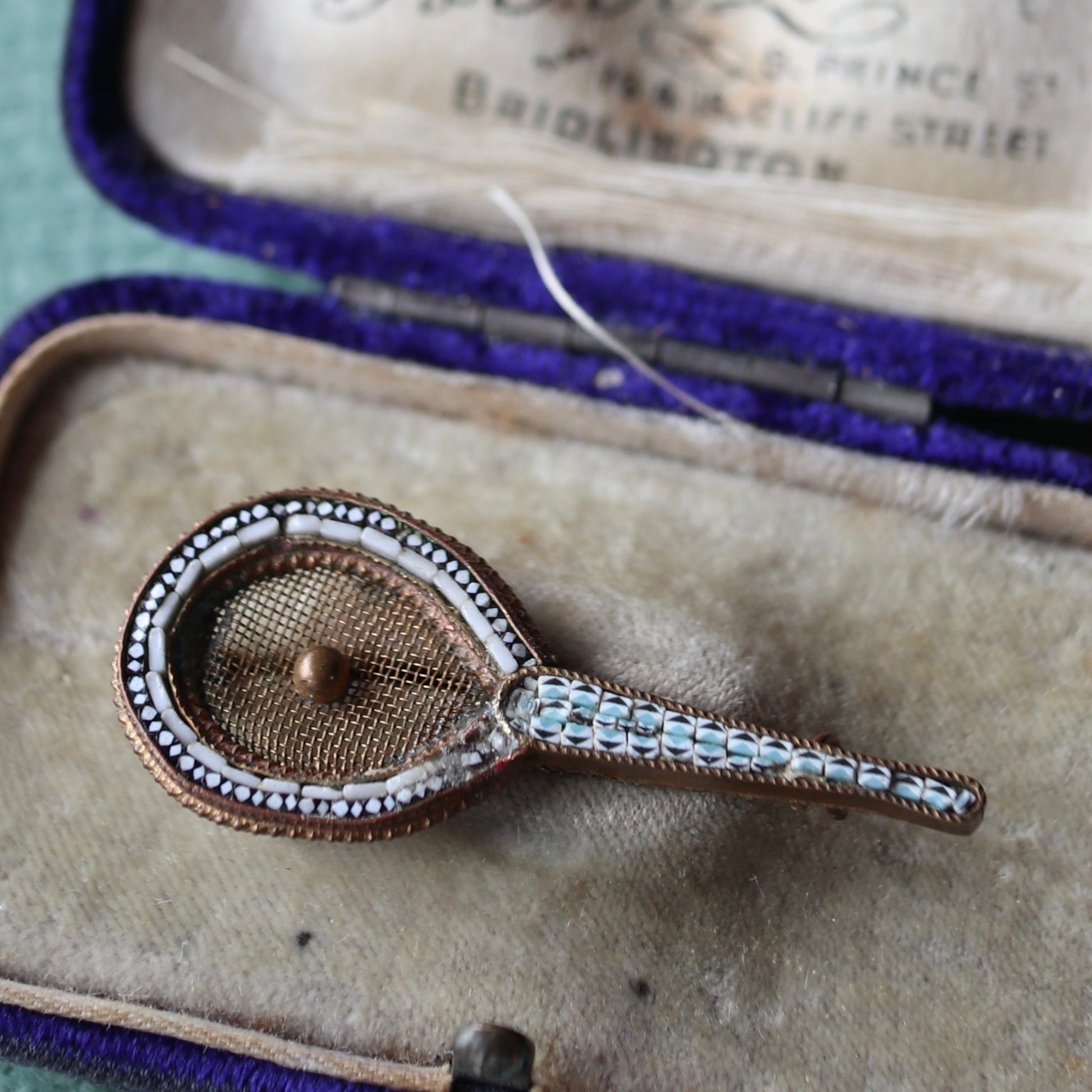 テニスラケットのモチーフのマイクロモザイクブローチ。