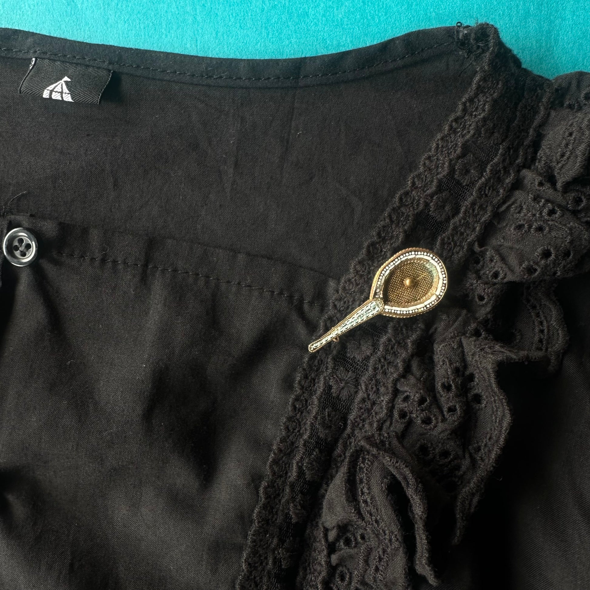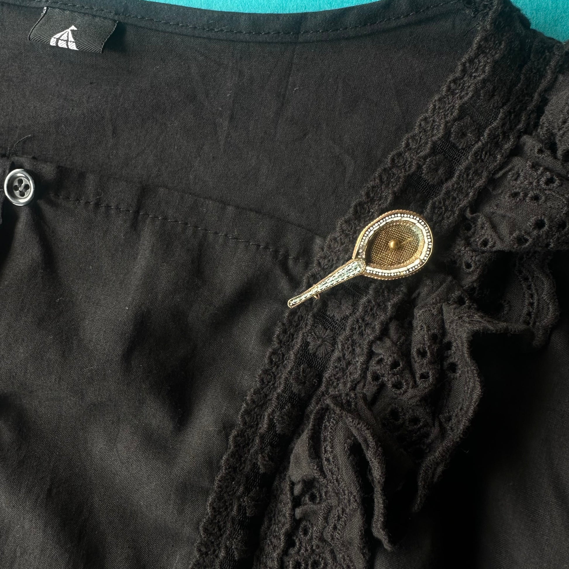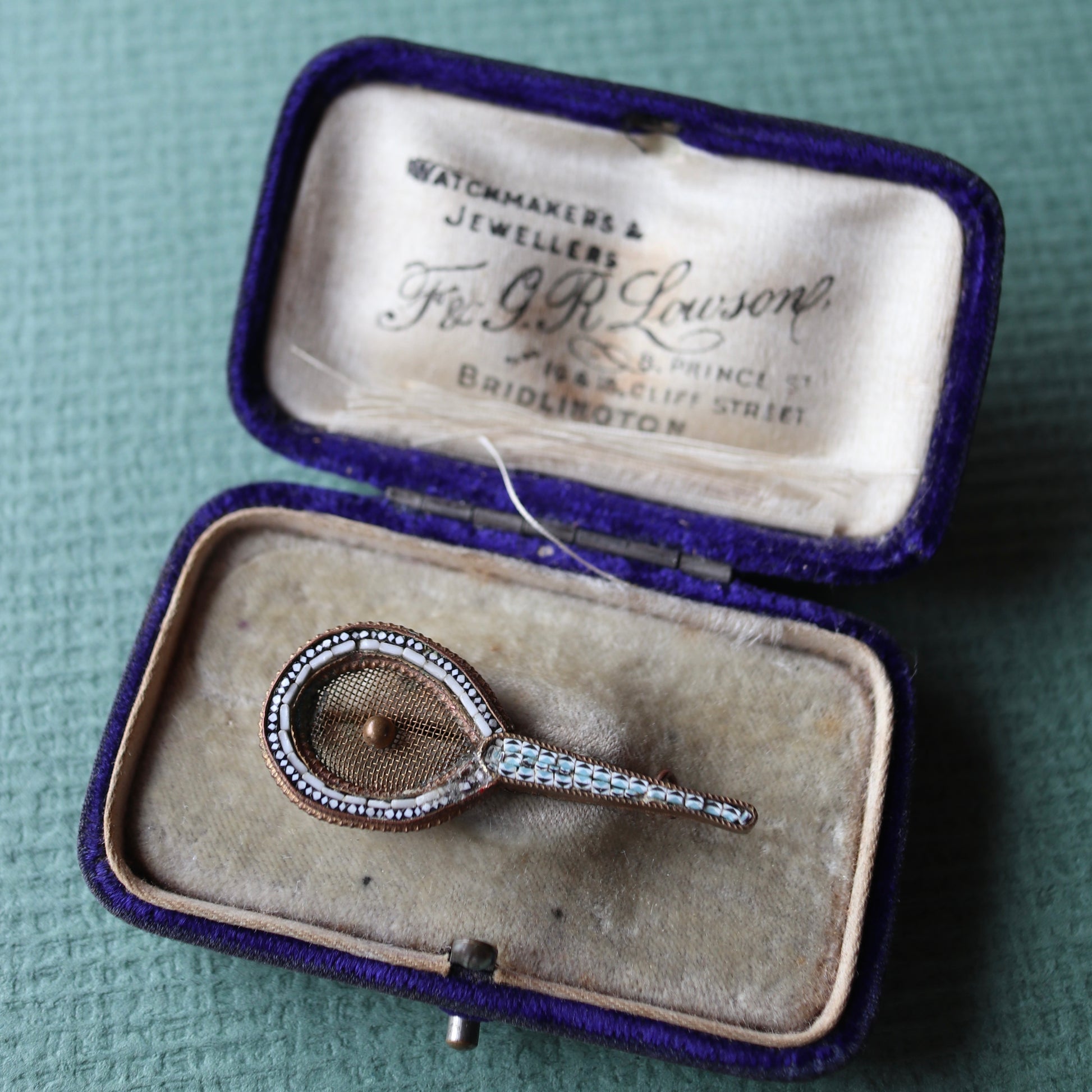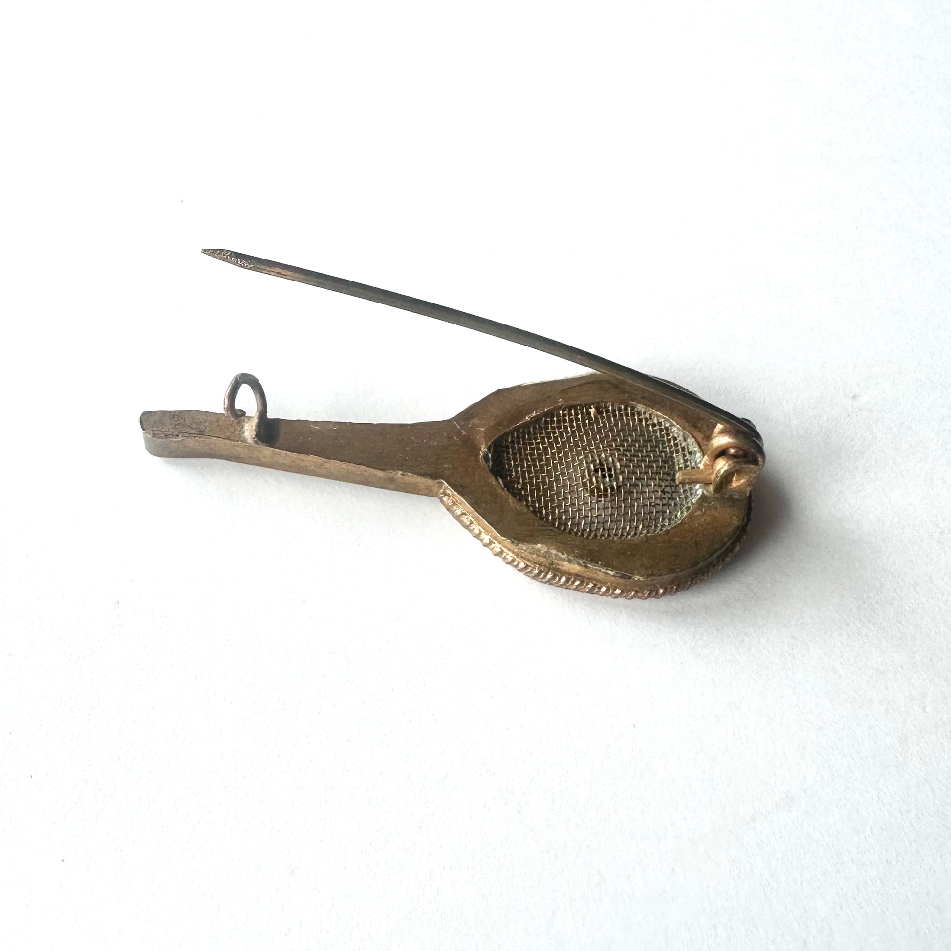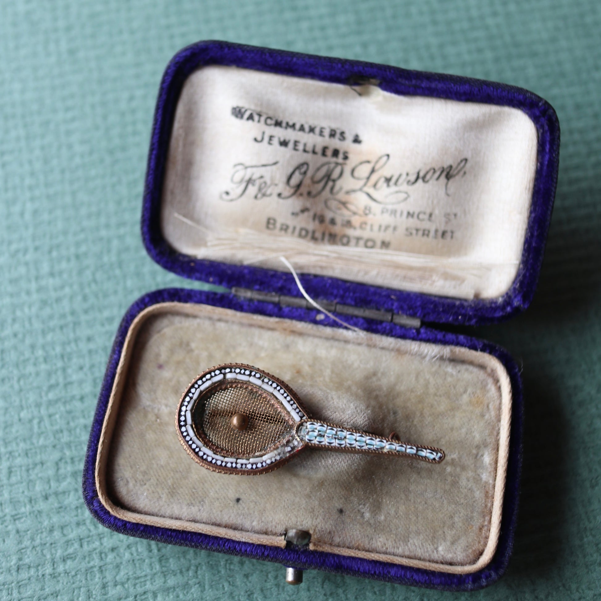 テニスラケットのモチーフのマイクロモザイクブローチ。