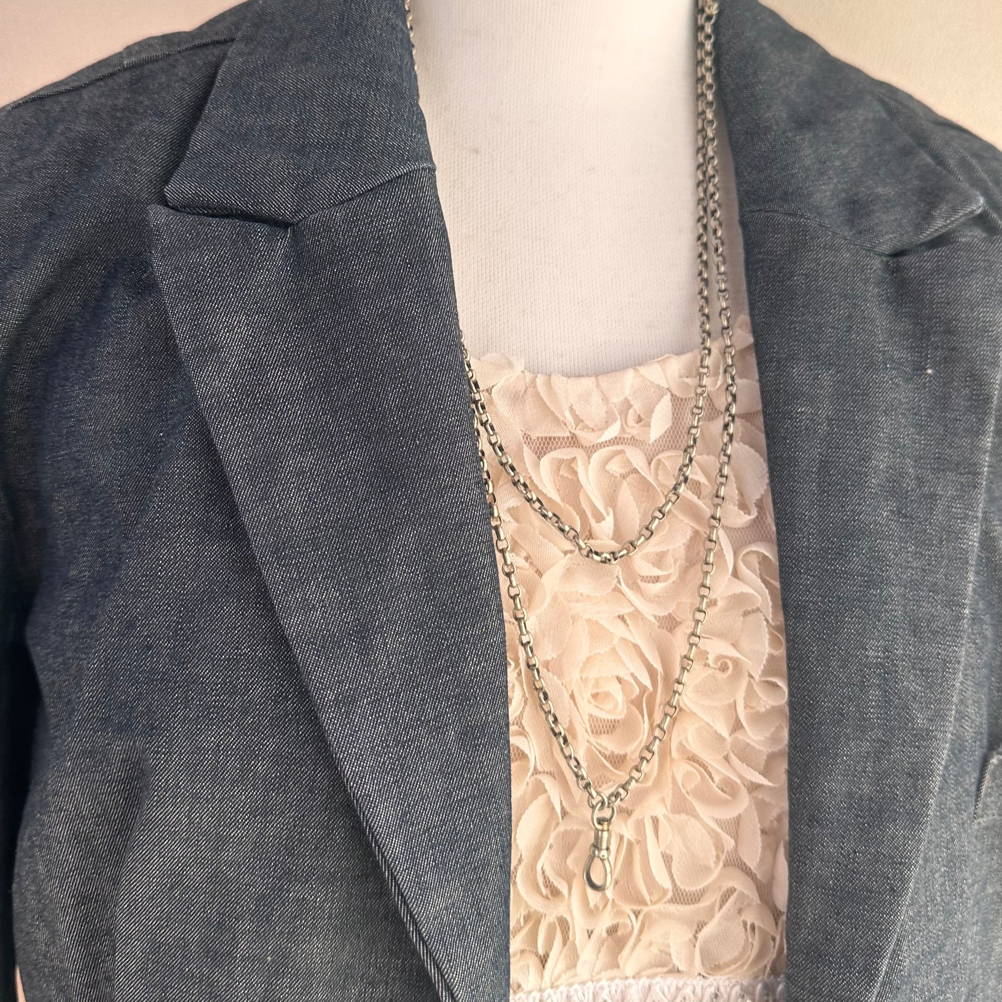 ガードチェーンは首に掛けてドッグクリップの先に懐中時計や、メガネ、ルーペなどを下げ、